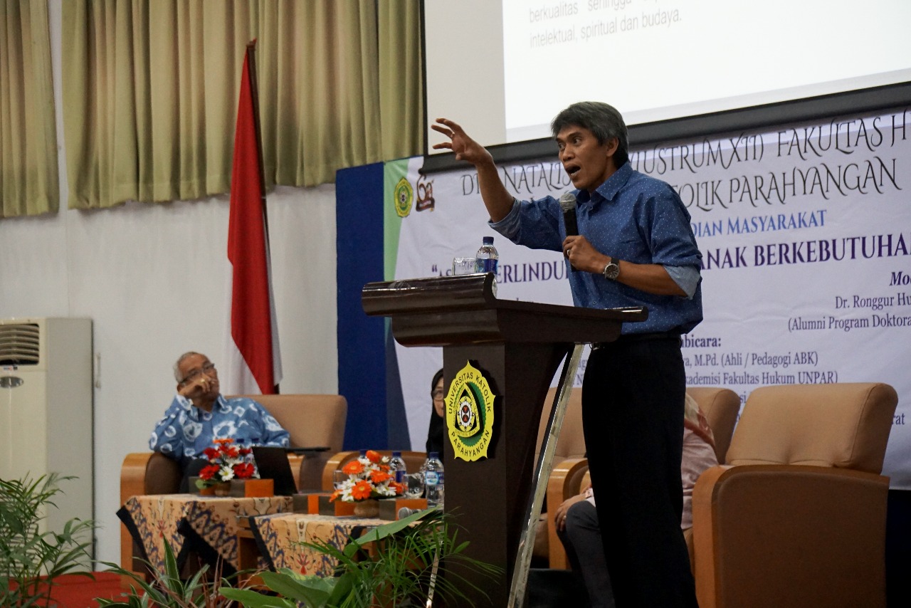 Sebagai rangkaian peringatan Dies Natalis ke-60 (Lustrum XII) Fakultas Hukum Universitas Katolik Parahyangan, pada hari Sabtu, 28 Juli 2018 telah diselenggarakan Seminar Pengabdian Masyarakat dengan tema “Aspek Perlindungan Hukum Anak Berkebutuhan Khusus”. Seminar yang diselenggarakan di Aula Kampus Pasca Sarjana Unpar, Jl. Merdeka No. 30 Bandung tersebut, telah dihadiri sekitar 160 peserta yang terdiri dari orang tua anak berkebutuhan khusus (ABK), perwakilan instansi pemerintah di Jawa Barat, sekolah dan pemerhati serta aktivis hak-hak penyandang disabilitas serta dari kalangan akademisi hukum dari Jawa Barat, DKI Jakarta dan Banten.